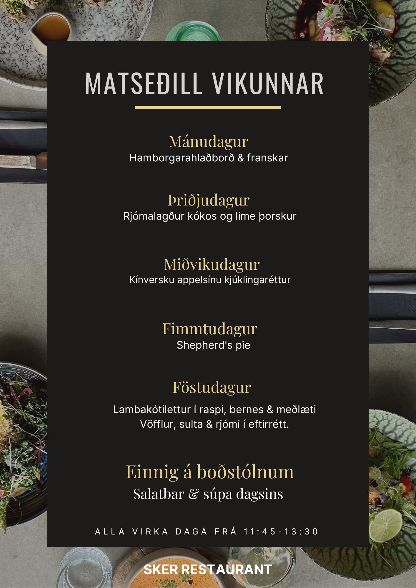 Best er að skoða story hjá Sker Restaurant á facebook eða Instagram til að sjá það sem er í boði í hádegishlaðborðinu.